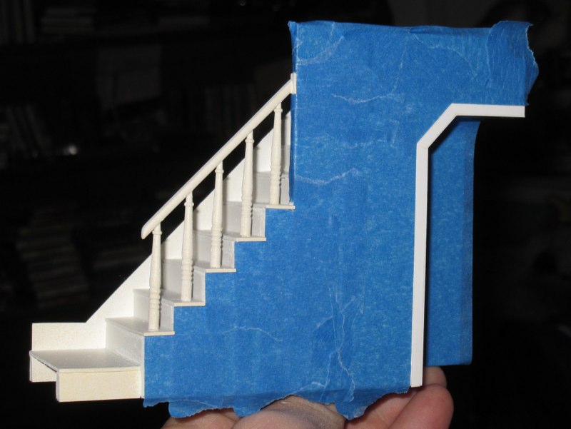 After I built the stairs I sprayed them with white primer, followed by a very pale, yellowish color to match the walls. When that dried I masked it to paint the dark trim color: