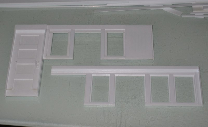 The rear of the ticket window will be partially visible through the bay window on the south side of the depot, so I built up both sides of the door, plus a separate piece to fit around the windows: