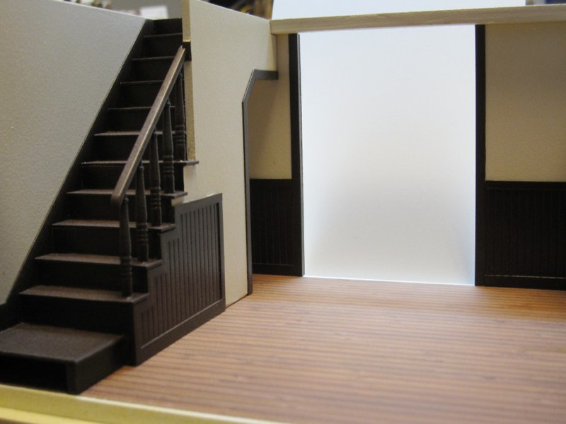 Here's how the room looks so far. The stairs are finished and painted, though not yet glued into place. The wainscots and other trim have also been painted and installed: