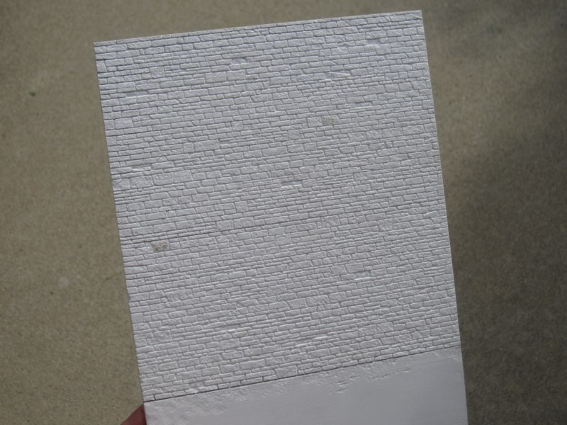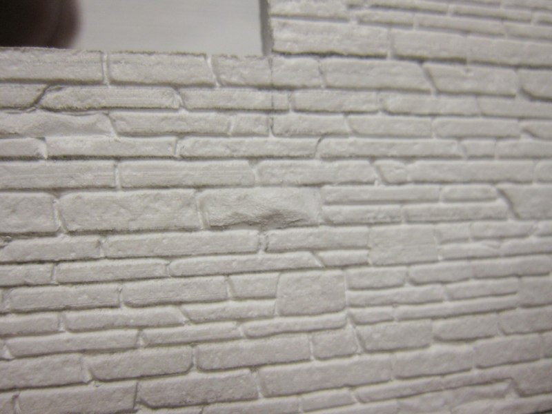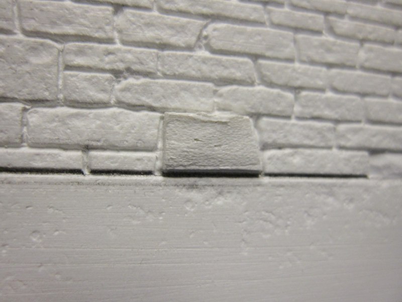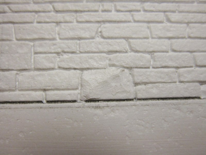 First I tried a product called Magic Sculpt. This is a two-part epoxy putty available from art and craft suppliers, and commonly used for sculpting. It's light gray. I applied some to a couple of corners, and after it cured I scribed mortar lines into it. It's a bit harder than the Kwik Plastik, and was a little tricky to scribe. In thin areas in sometimes flaked off during scribing: