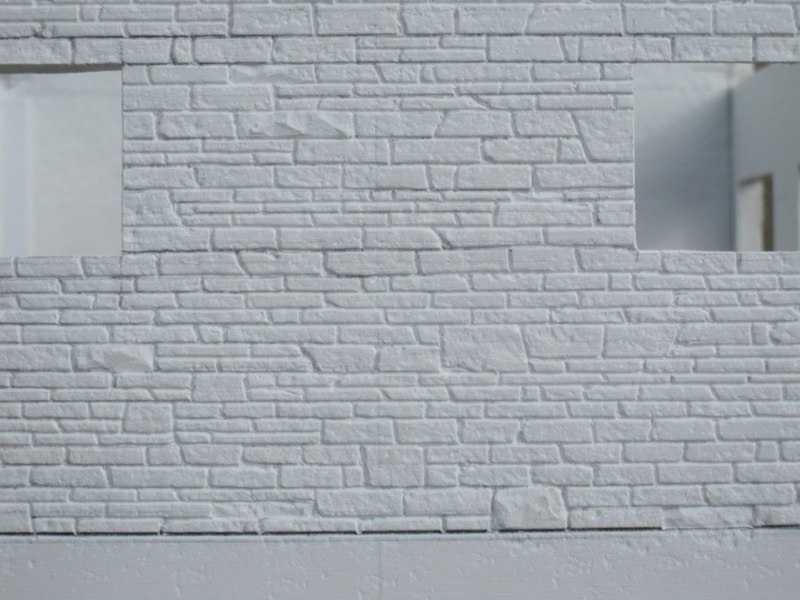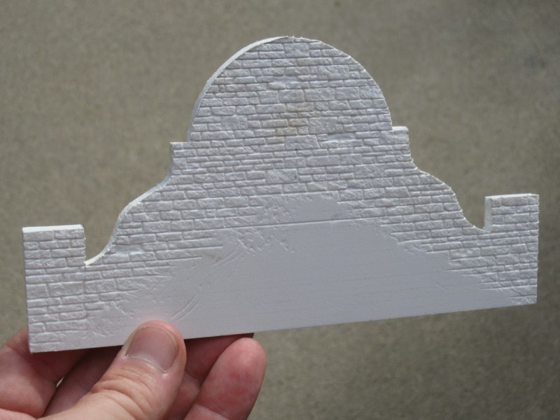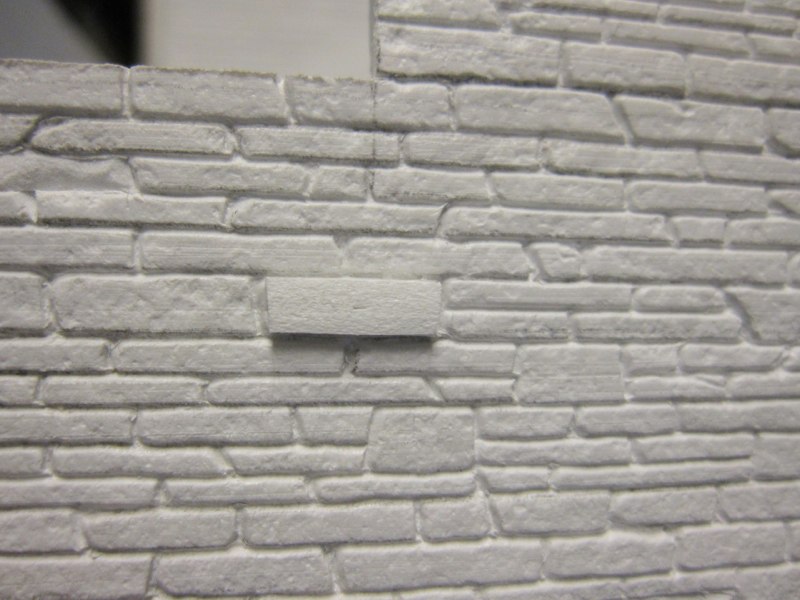 I wanted some of the stones to stand out from the wall, to give it more dimension. To do this, I start by gluing thin slices of Sintra to a few random stones. Then I use a hobby knife with a new, sharp #11 blade to carve them. Here are a couple before and after shots: