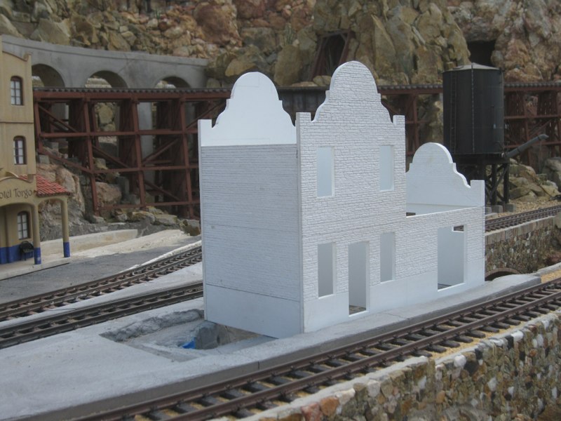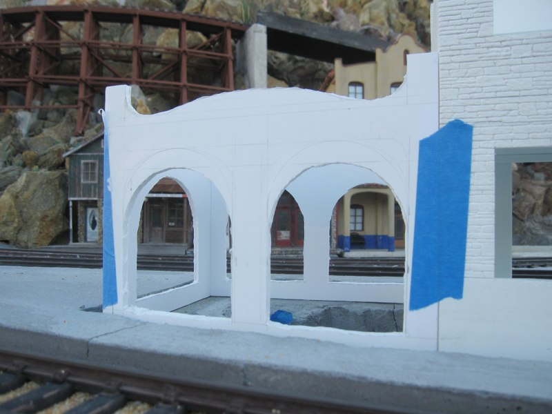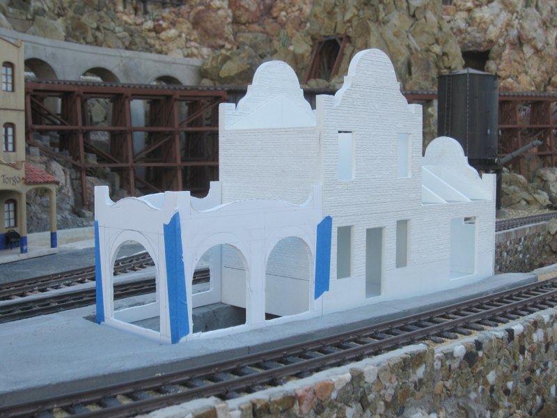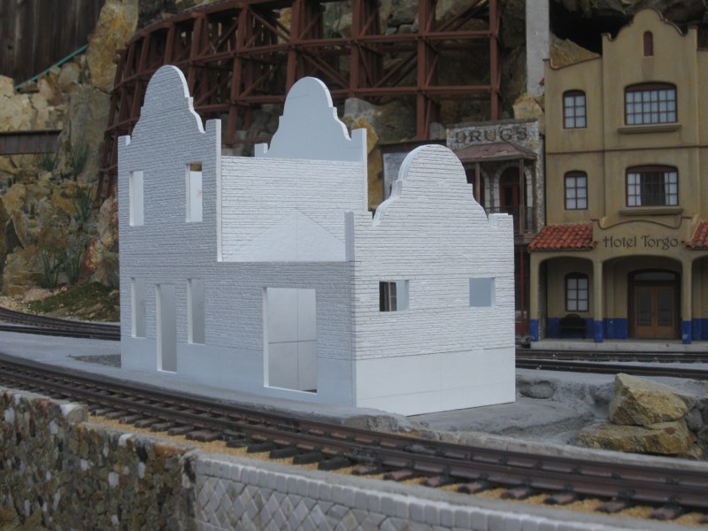 Because the east wing is an odd shape, I decided to go with a flat roof and parapet, rather than a peaked roof. I feel this will also give the building more visual interest, and I've seen photos of a couple prototype, mission-style depots that had a flat roof on one end. I put together a mockup of the east wing and taped it to the model to see how it will look: