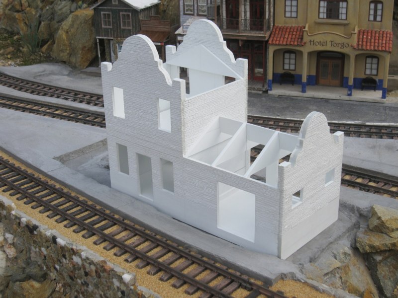 Because this depot will sit so close to the "edge" of the layout, a detailed interior is a necessity! However, this is the first building I've made with an interior that is also visible from all four sides. Previous structures had the rear wall against a cliff, allowing me to make that wall removable. (It also cut down on the amount of exterior detailing!) The interiors could be built into a box that slides out the back of the building.