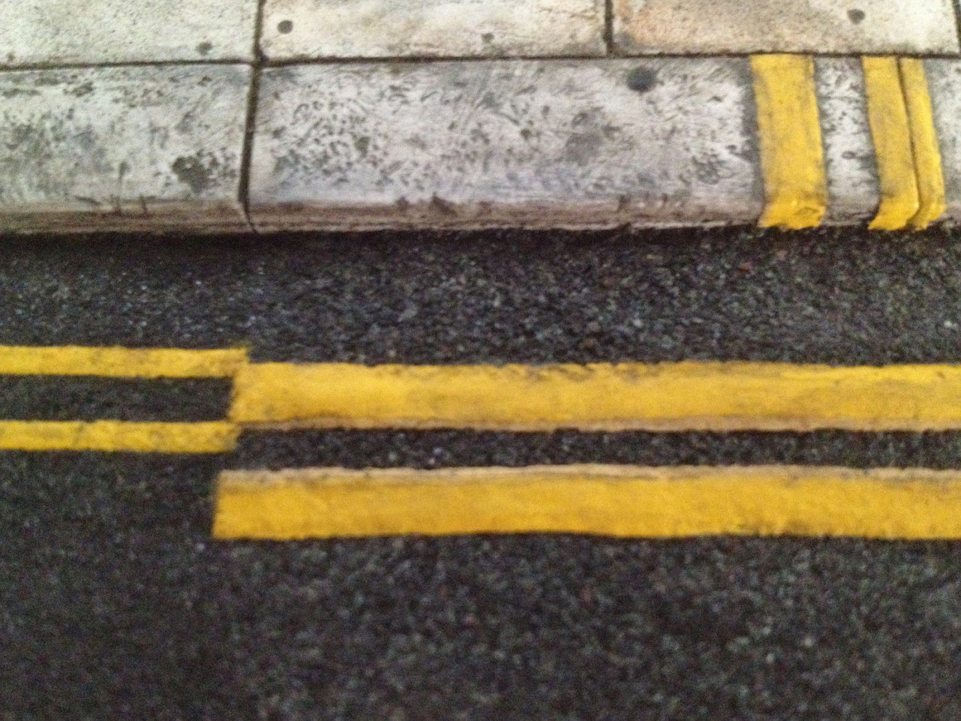 Its a little section of Jermyn Street in London outside the Cavendish Hotel (Lottie Crump in Vile Bodies ran the place, and there was the 1970s TV series The Duchess of Duke Street) where all the lines in the footpath, the kerb stone and the asphalt resurface all aligned in a very unexpected way, and all I had a were couple of night time snaps to guide me.