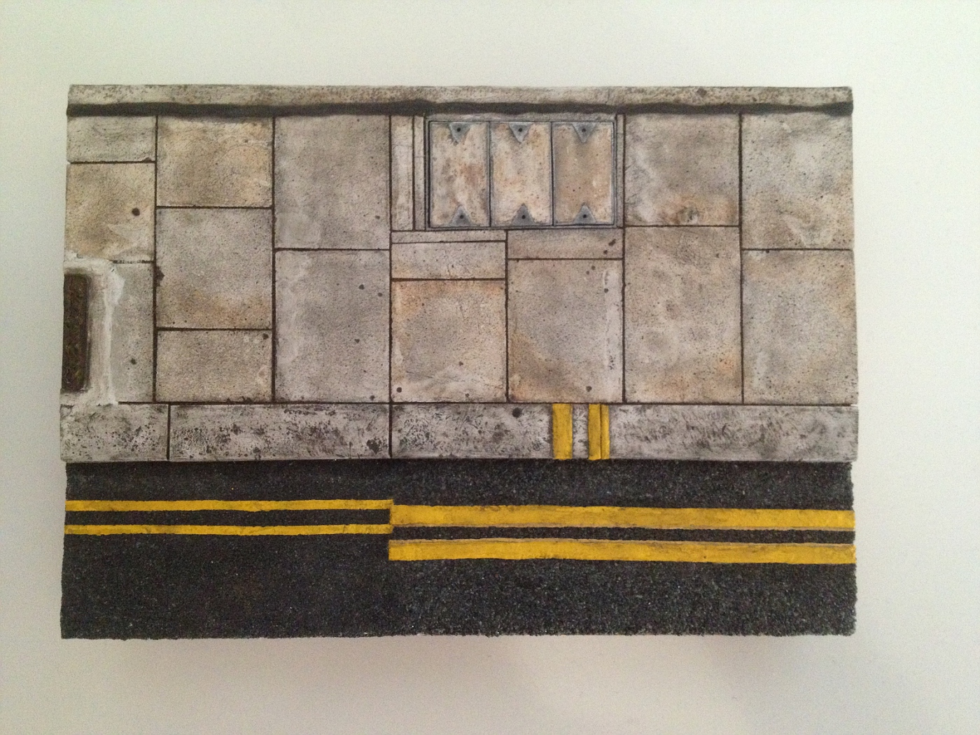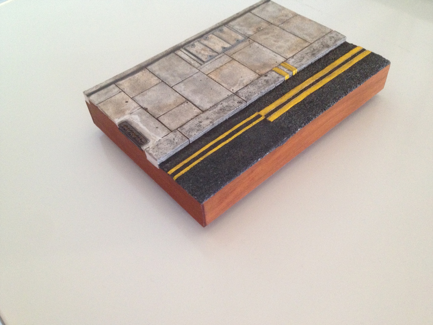 this is great work. The idea with the acrylic based lines is very interesting. The section looks very realistic. Especially the bright concrete repair around the cover and the chewing gum blotches catched my eye. Could you please write something about the coloring of those three iron framed concrete covers, i. e. of the steel frames? It's a bit hard to tell, but it looks very much like "shoe polished" steel on sidewalks.