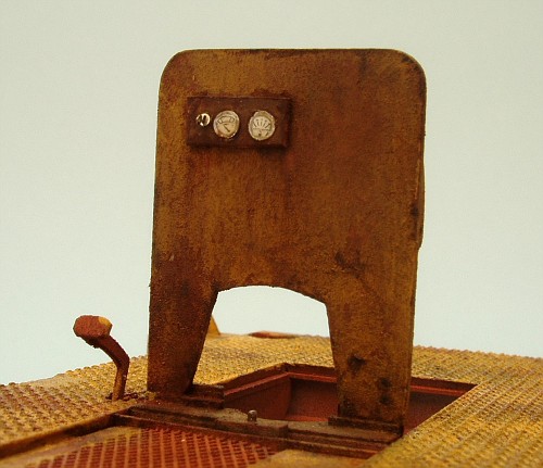 I personally would recommend less to minimal texture (otherwise it sort of looks like one of those abandoned Sherman tanks sitting in the surf of some Pacific island).....these metal pieces were not cast that rough, nor would they oxidize like that.....and for the chipping I would recommend another attempt at the hairspray technique (am curious how you approached it that gave you bad results)....or try the hairspray in combination with the salt technique. For small positive and negative detail chips I recommend painting them on with a Vallejo acrylic and an 0/10 to 0/18 brush.
