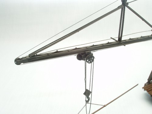 represents the "extended boom" version so two flat cars of ties can run behind it. The locomotive was