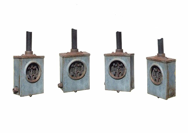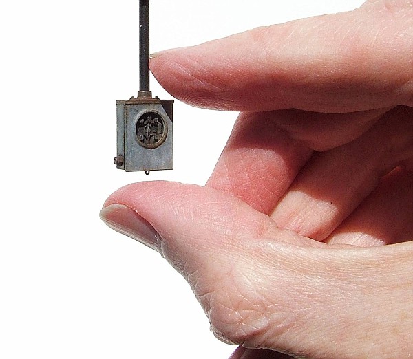Another bit of detail: a tired old meter box (sans meter). Researched on Flickr. I 3D printed the box and the interior insert. I added a conduit fitting turned from .06 styrene hex and a plug also made from styrene. The bottom lock tab is .010 styrene and the mast bolts are from Plastruct hex stock. The wiring is annealed brass wire. (The black post is temporary). I finished it off with a few leaves stuffed inside.