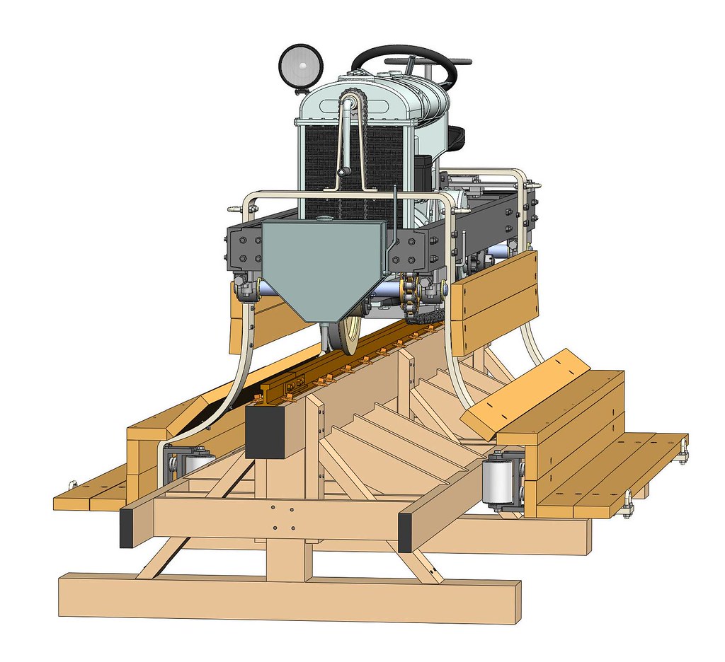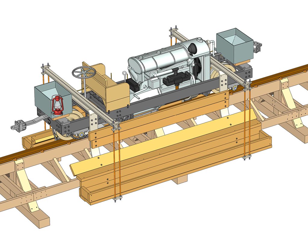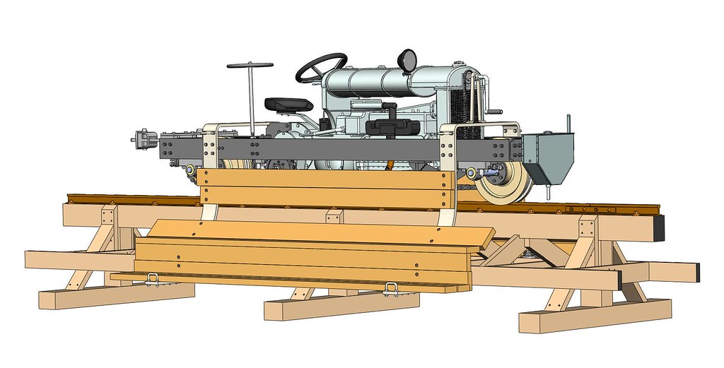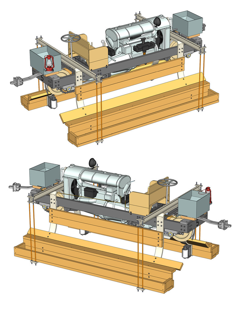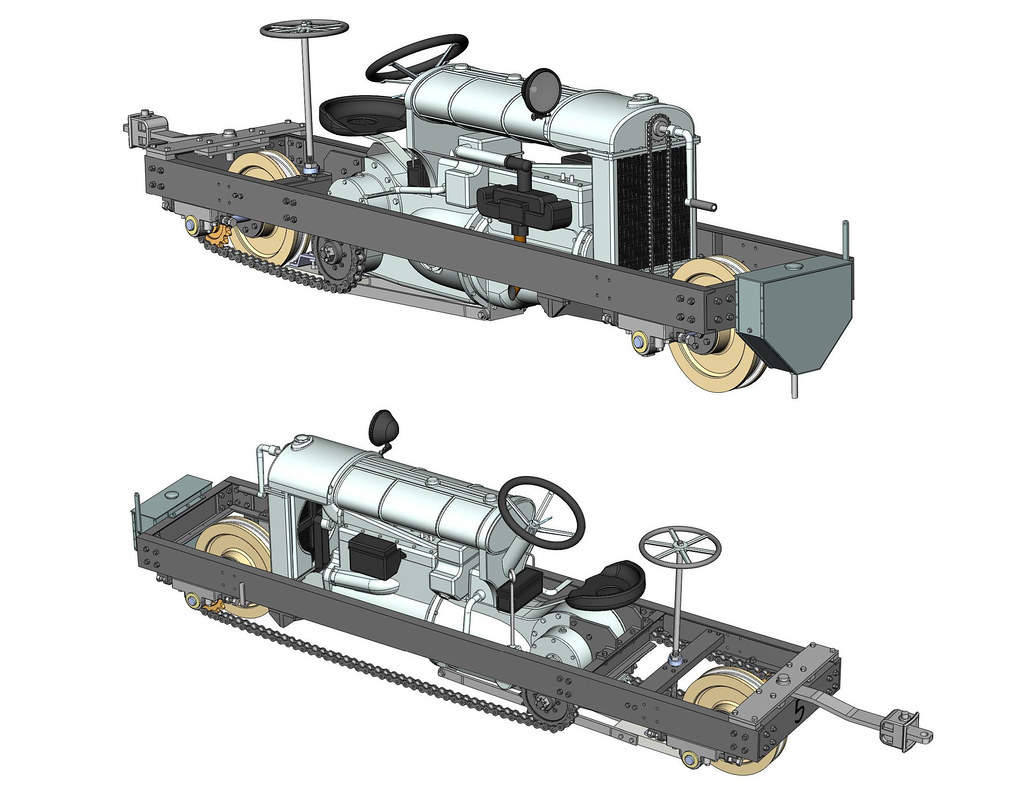 I have pretty much finalized my design (yeah, right). This is the version seen in the vintage photo at the start of the topic, and in the top canyon shot Mike provided. Kind of a "work truck" for hauling construction supplies when they were building the line. I found a 1923 Popular Science article that had a tiny, but wider crop of that first photo showing a front sander. The drive is pure conjecture, but hopefully plausible and will have to do unless I find new information. I added a headlight because I am a model railroader and we love to adorn our critters. At least it is of proper vintage. There will also be chains attached to the U bolts, but no antlers.