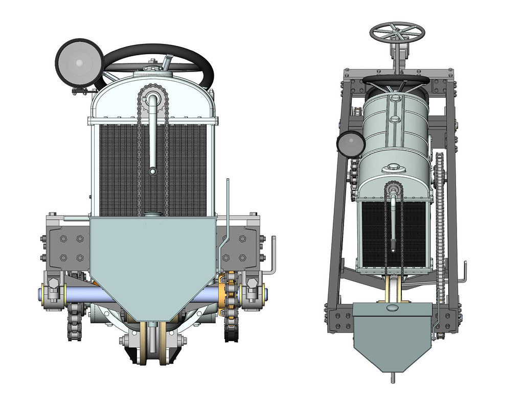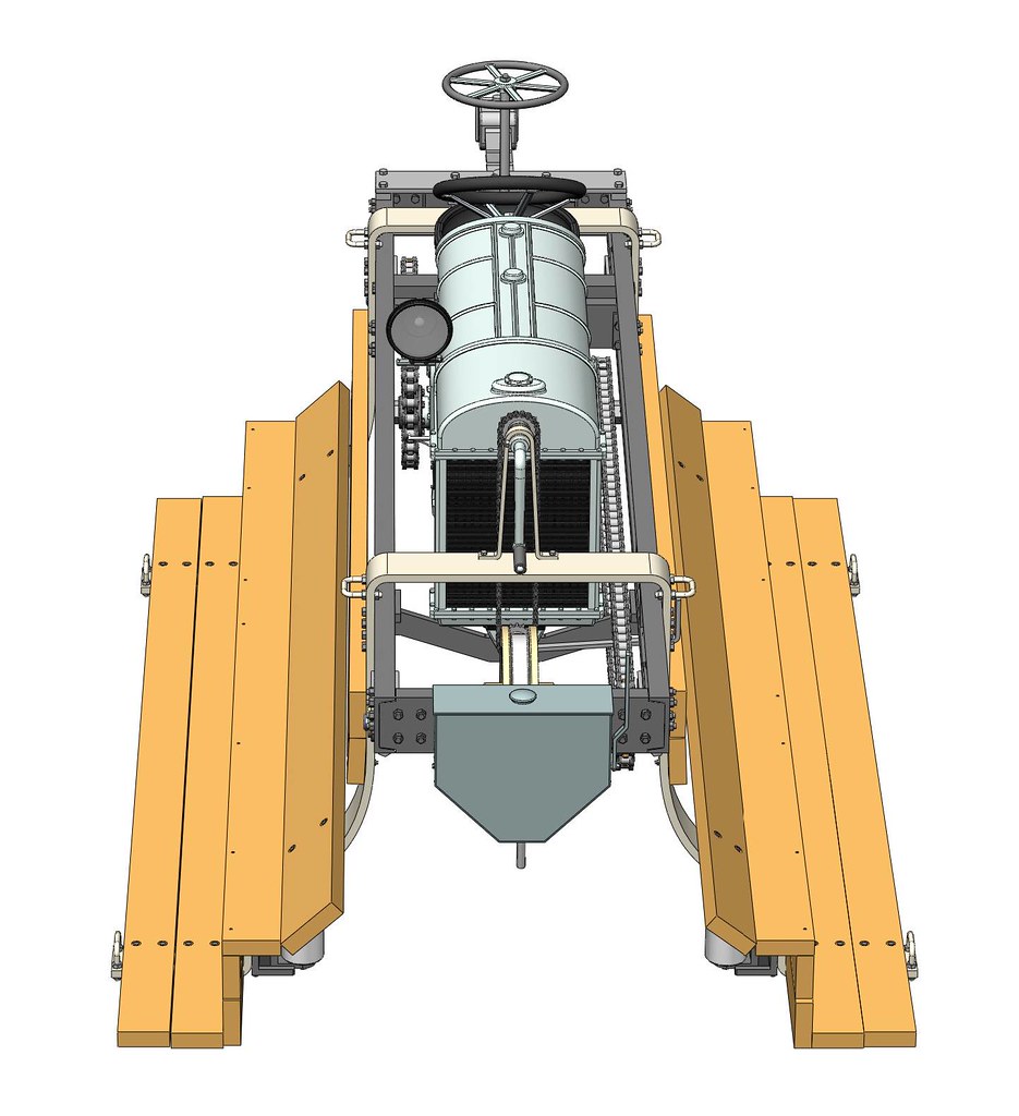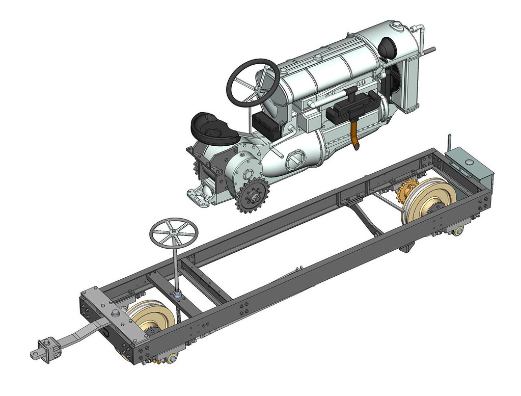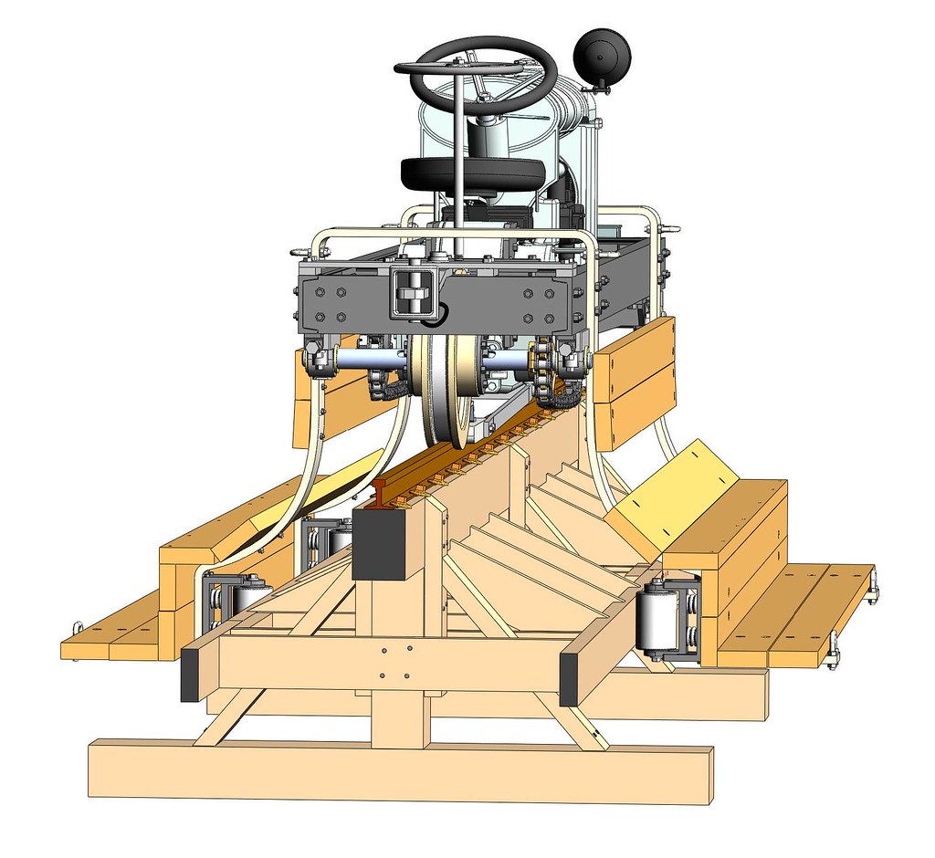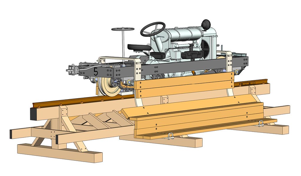 I have pretty much finalized my design (yeah, right). This is the version seen in the vintage photo at the start of the topic, and in the top canyon shot Mike provided. Kind of a "work truck" for hauling construction supplies when they were building the line. I found a 1923 Popular Science article that had a tiny, but wider crop of that first photo showing a front sander. The drive is pure conjecture, but hopefully plausible and will have to do unless I find new information. I added a headlight because I am a model railroader and we love to adorn our critters. At least it is of proper vintage. There will also be chains attached to the U bolts, but no antlers.