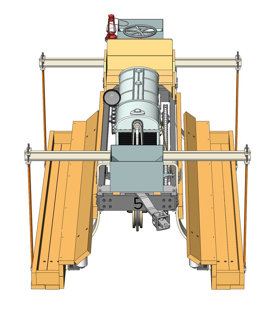 I noticed you have changed the design from the one with the steel 'I' sections to hold up the loading arms to this one. I wonder if this was an earlier version used during the construction of the operation, and functioned better for hauling lumber and such (due to the binders holding the load in place), and the 'I' beam model a later version because it was able to provide a trough/bin into which to load the salt bags and other supplies.