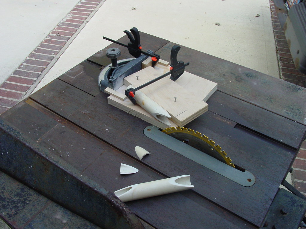 Here's a photo of the fixture that I used to cut the pipe into a wedge shape. For a better fixture I would have made the base 1/4" thick instead of the thicker one, and a piece to hold down the pipe from coming up when cutting. I will finish up this part when I can get back in to my shop.