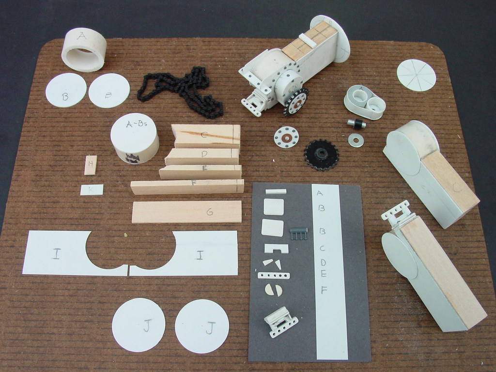 Glue parts B on the ends of part A. On draft paper draw a simple plane for the side view. draw a rectangle 1" x 2 5/8". Locate  the center location for the 1 1/16" diameter circle up in the upper left hand corner of the rectangle up 11/16" from the bottom and 7/16" over from the left side and draw the circle. Set the A.-B. part on the drawing and cut the wood part C,D,E,F into the circle. The bottom of the circle will set on top of part G. Using the above lay-out cut the circle in part I. and add part K. and H. I cut all the wood parts longer than needed and trimmed them all after the assemble was all together.to finish this up add parts J. over the top of part B. ( note that more parts will be added to the top, bottom and the two sides.